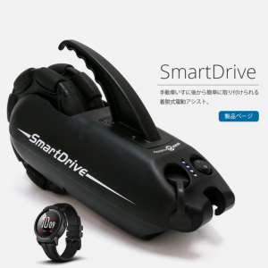 スマートドライブは、手動車いすに簡単に取り付けられる着脱式電動アシストです。